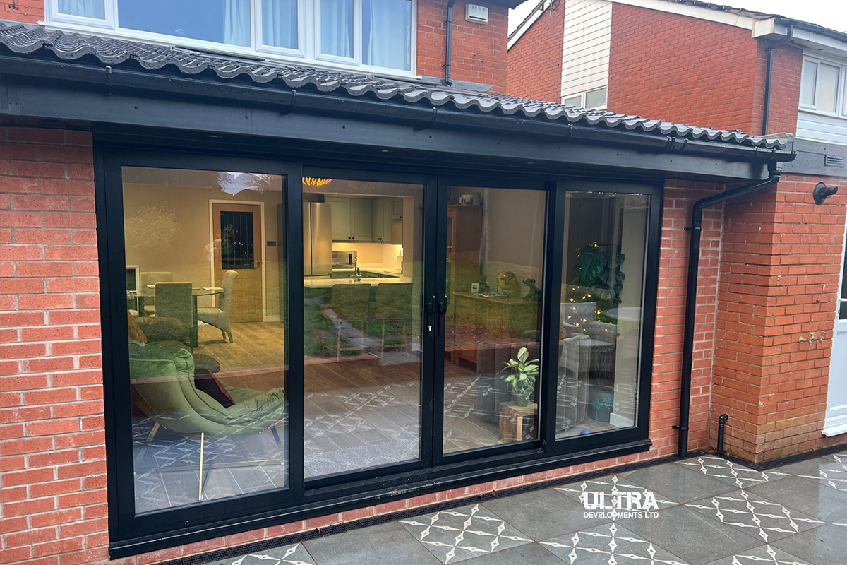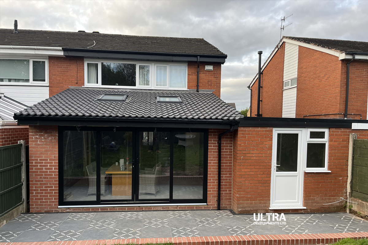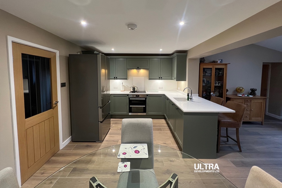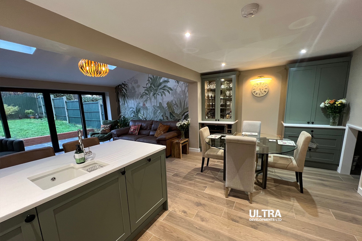 Our sister company, Ultra Developments, were recommended by a happy customer from 18 months ago, this project was all about creating a stunning open-plan living space. Our team was tasked with removing an outdated lean-to conservatory and kitchen, offering expert advice to completely reimagine the home.