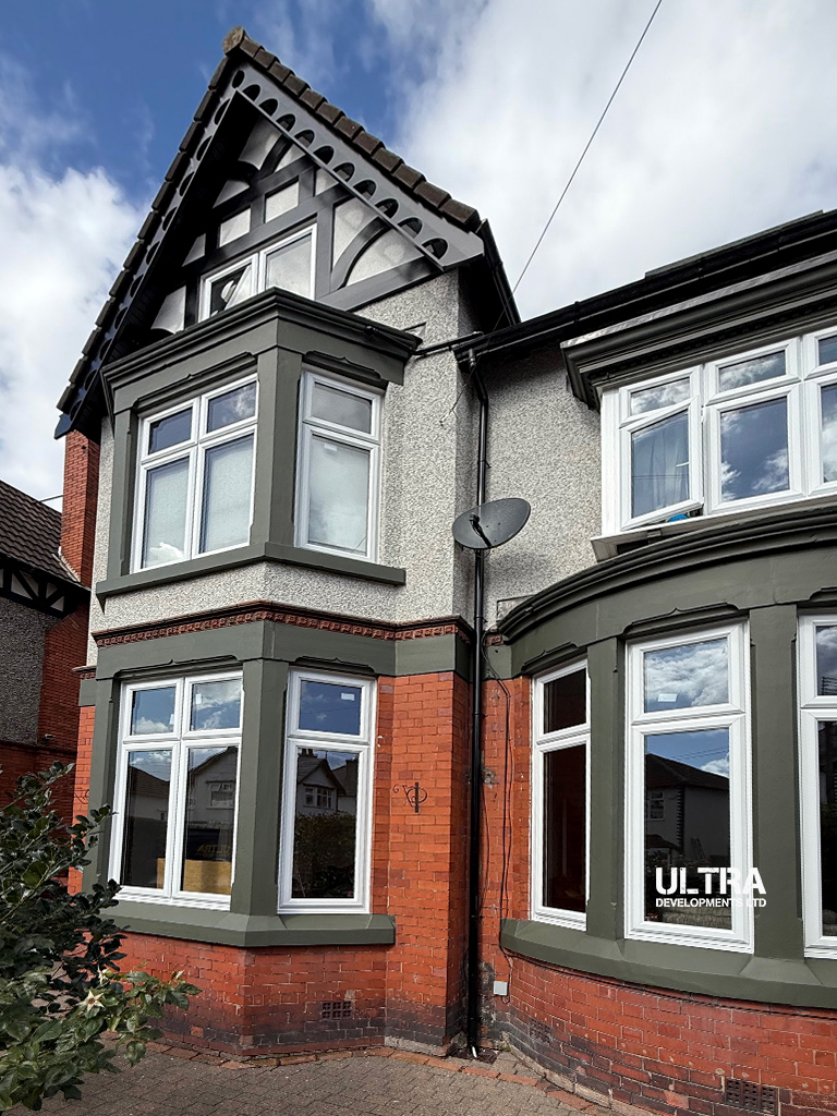 Our sister company, Ultra Developments, recently installed new white UPVC windows across three floors of this beautiful Victorian semi-detached home in L18. Alongside the new windows, we fitted downpipes and hoppers, carried out painting, and completed pebble dashing, all of which have completely transformed the property’s appearance.